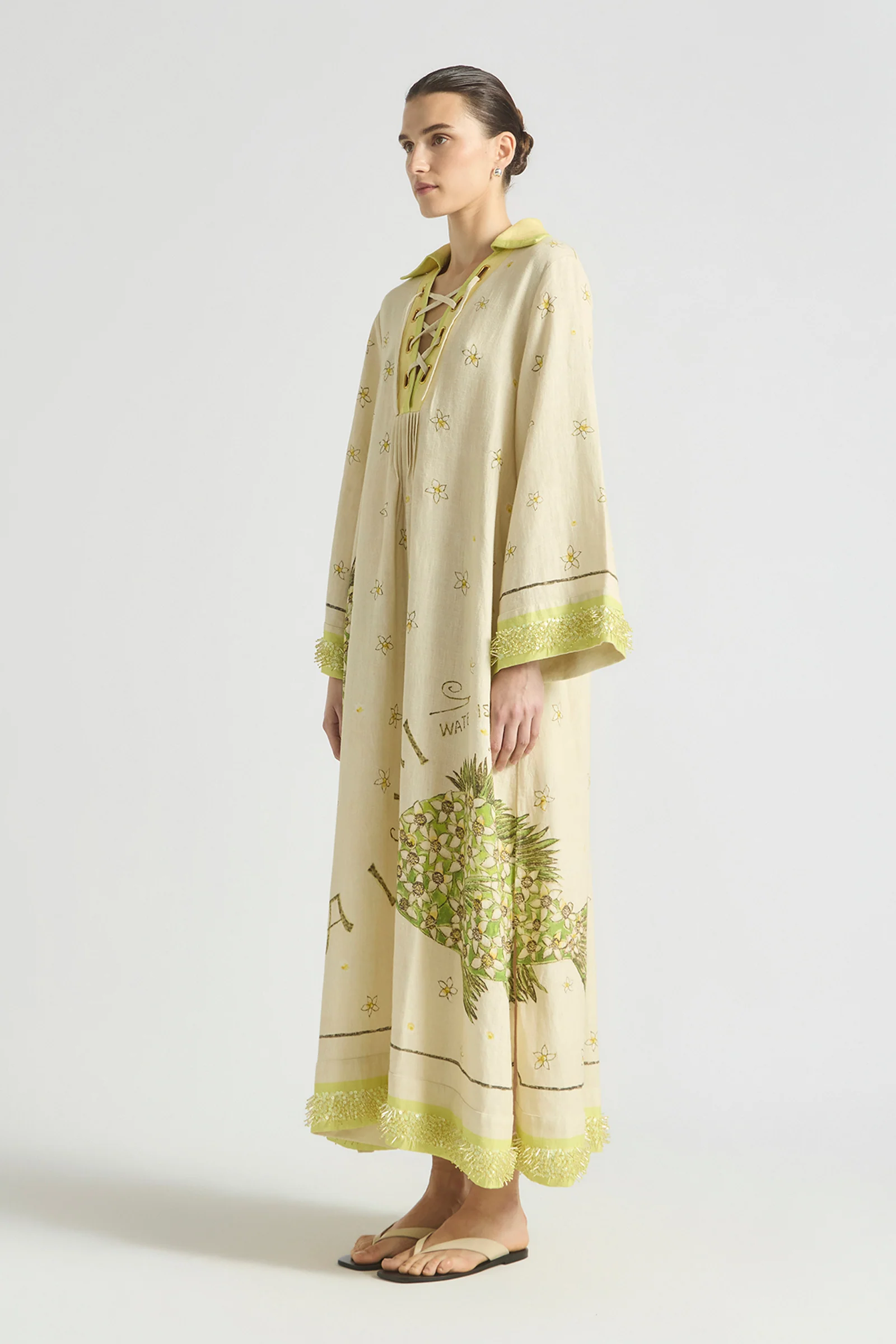 The Brightside Lace Up Kaftan in Daiquiri showcases our original in-house print, hand-drawn by our founder and placed with intention to flow with the garment’s relaxed drape. Crafted from soft linen, it features a lace-up front V-neckline with gold eyelet hardware, side splits, and luminous lime beading along the cuffs and hem. Pin-tuck detailing at the centre front and back yoke adds subtle structure, while the loose silhouette moves effortlessly with the body. For sunlit days, seaside dinners, and everywhere in between.