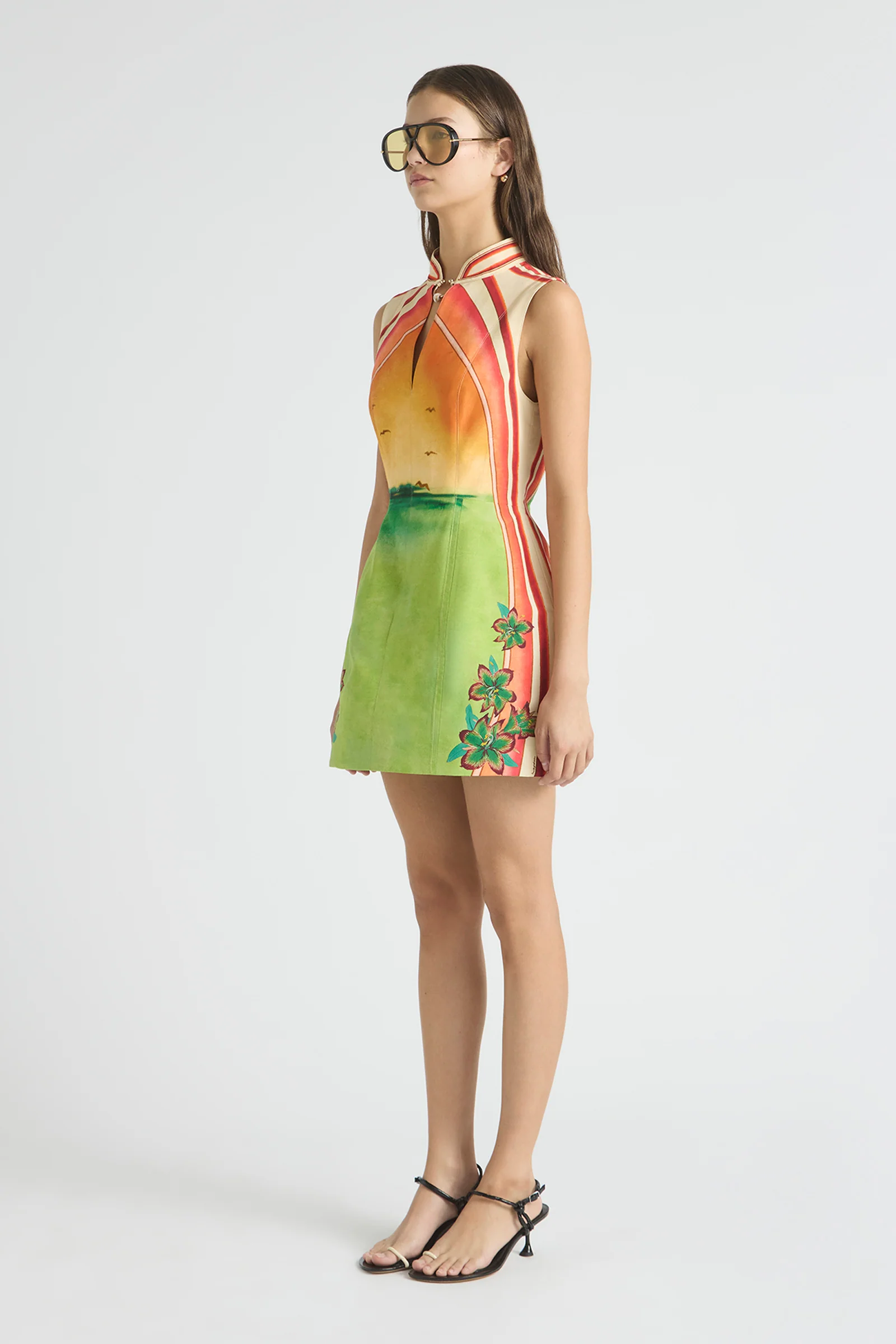 The Golden Break High Neck Lantern Mini Dress in Sunset brings bold, playful energy. A high neckline and softly structured lantern shape are finished with surfboard-inspired placement artwork in sun-warmed gradients, framed by graphic border stripes. Floral motifs bloom at the hem for a considered finish.