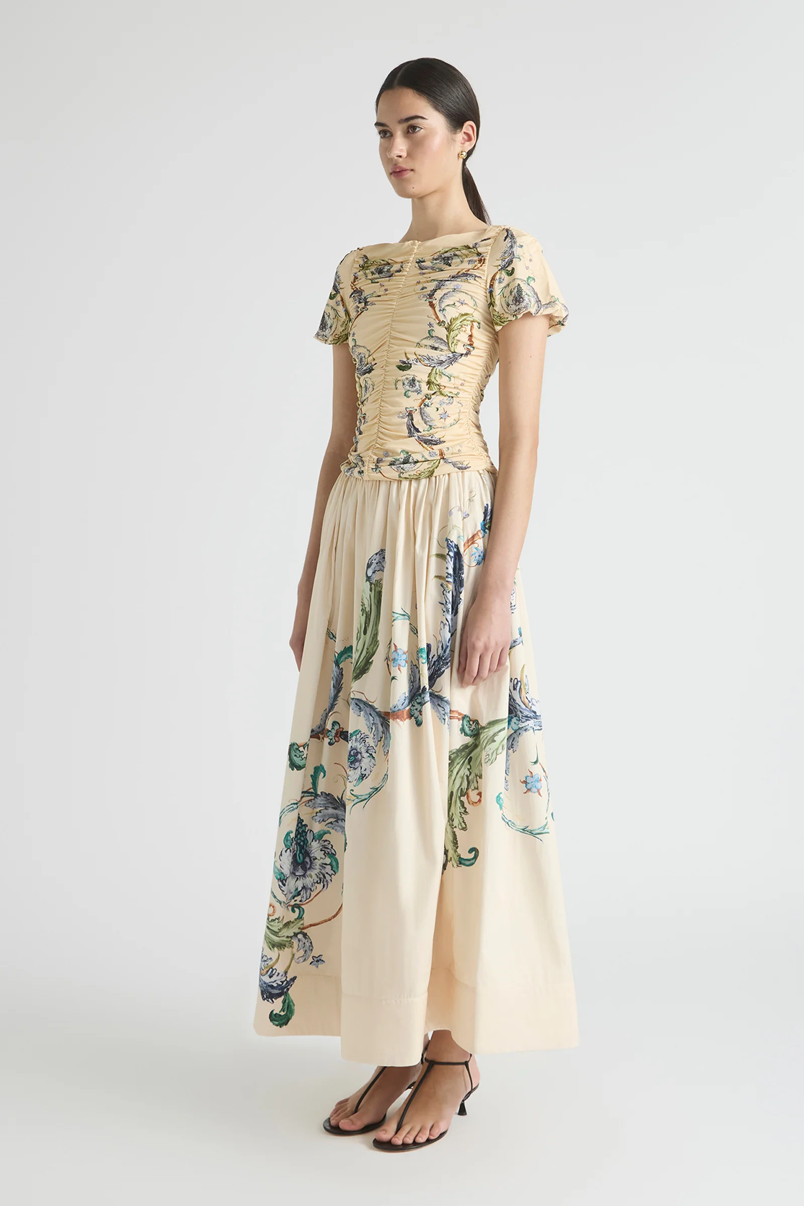 The Le Bon Bon Ruched Puff Sleeve Top in Azure contours and flatters, with soft ruching through the bodice and gently puffed sleeves. Thoughtfully placed artwork frames the waist, with sweeping vines and painterly florals in cool blue and green tones. Fresh, feminine, and unmistakably Antipodean.