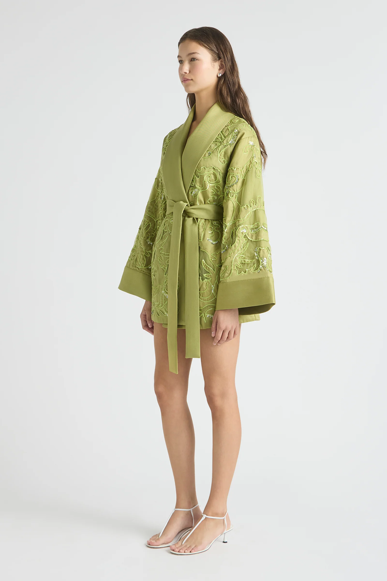 The Oasis Embroidered Robe Dress in Citron is an elevated statement piece, intricately finished with citrus embroidery, delicate appliqué, and subtle sequin detailing. Cut in a softly structured robe silhouette with a wide lapel neckline and dramatic flared cuffs, it cinches at the waist with a self-tie belt for a flattering, effortless shape. Luminous, refined, and unmistakably luxe.