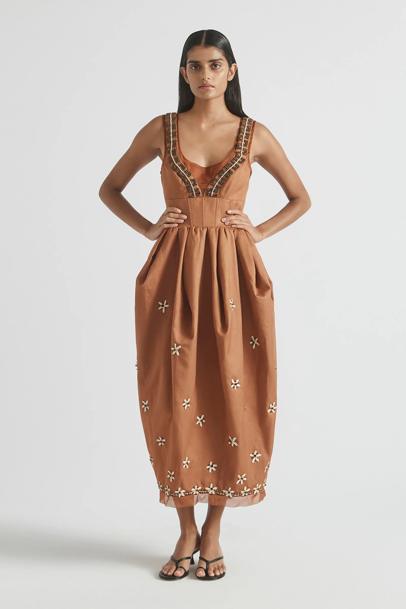 The Starlight Tulip Midi Dress exudes effortless elegance with its lustrous silk linen organza fabric. Featuring exclusive in-house placement embroidery, contrasted with soft organza bands along the neck, shoulder, and hem, this dress is detailed with a scallop hem, crystals, and ribbon flowers. Perfect for garden parties or evening events, pair it with delicate heels and simple jewellery for a refined, chic look.